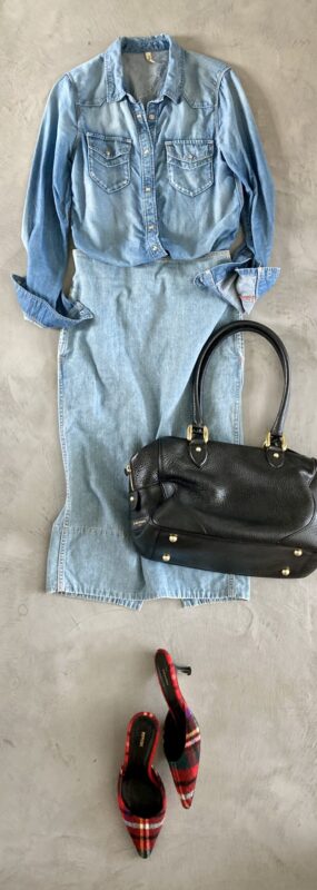 グレーデニムとタータンチェックのミュールで変化球にしてみたらいけるかも。