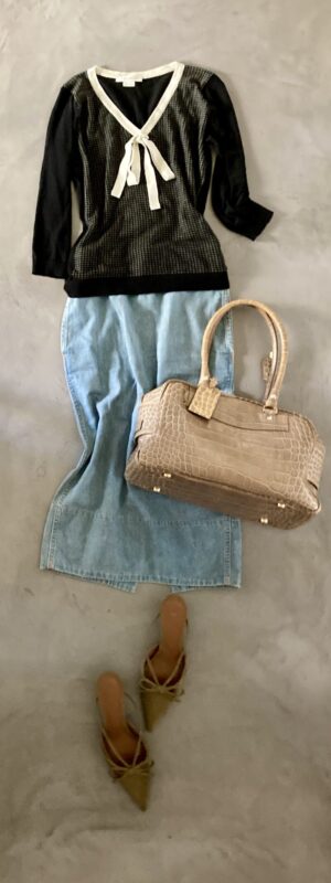 7分袖ニットとデニムタイトスカートの年相応コンサバコーデ。