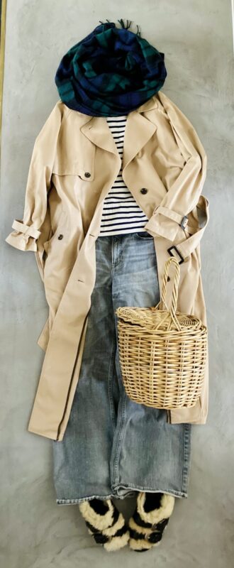 バスクシャツとジーンズ、トレンチ、タータンチェックのストールの定番アイテム揃い踏みコーデ。