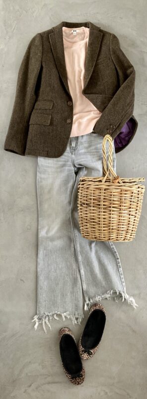 カゴバッグとレオパード柄バレエシューズ、セーターはピンクをチョイスしてパリマダムになりきったつもり(笑)