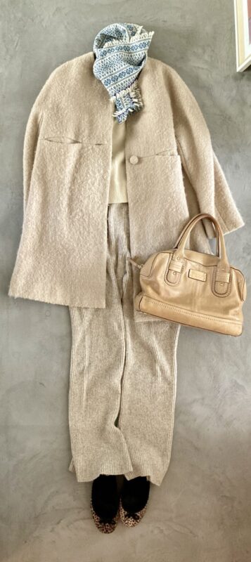 ニットパンツとオフホワイトのウールセーターでエクリュカラーのワントーンコーデに。