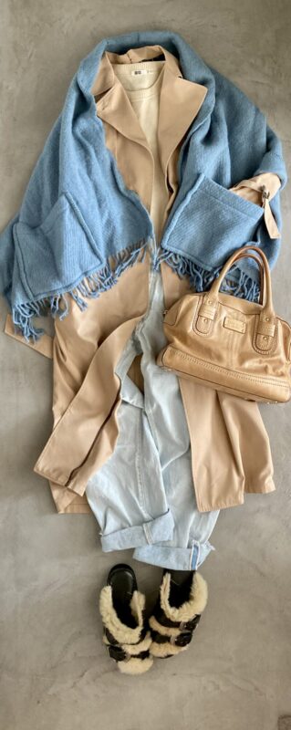 いつものトレンチコートにラプアンカンクリのショールを羽織って。