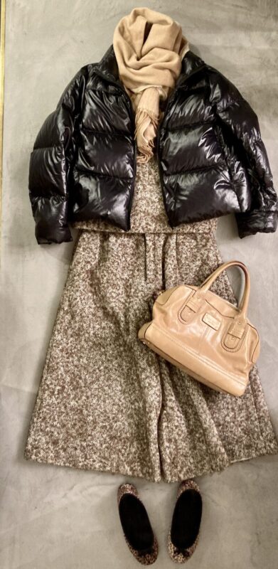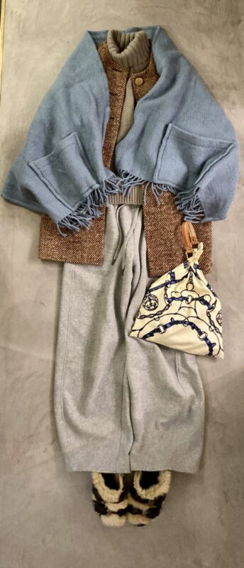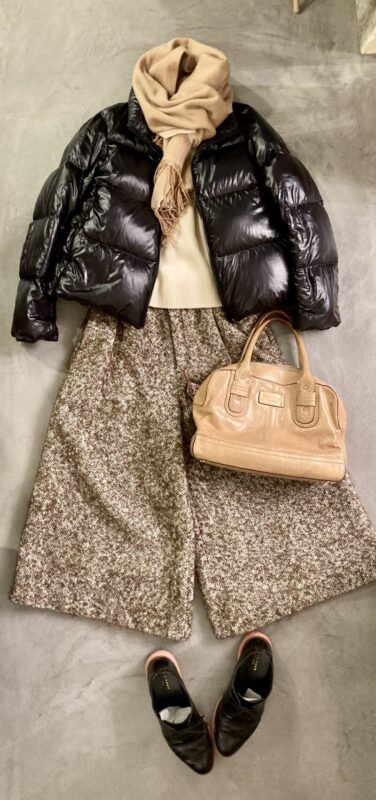 同じくツイードコートとウールショールで防寒です。