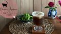 ソファに座るくろねこニケとパリ風リビングの多目的テーブル