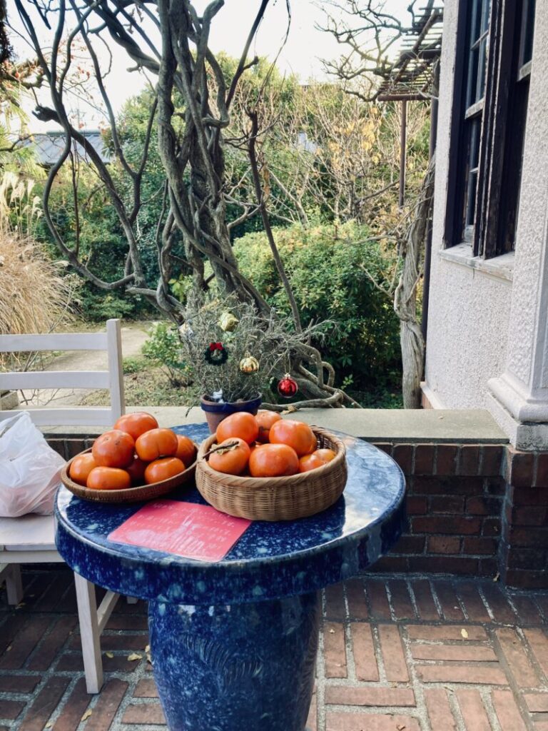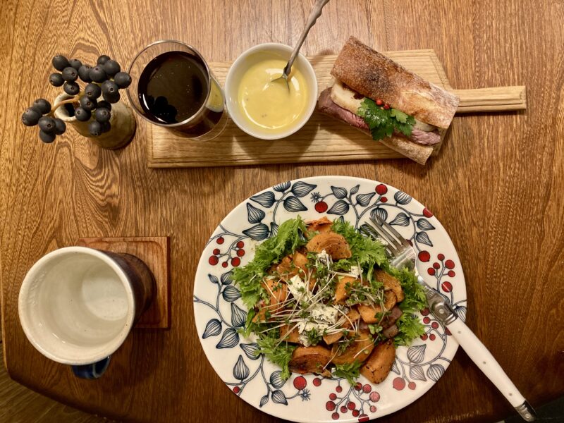 夕飯は駒井家住宅の庭で採れた柿のサラダとル・プチメックのローストビーフサンドでひとり飲み。
