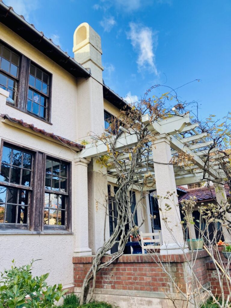 窓には藤棚が設けられ、芝生の庭に小さな池。